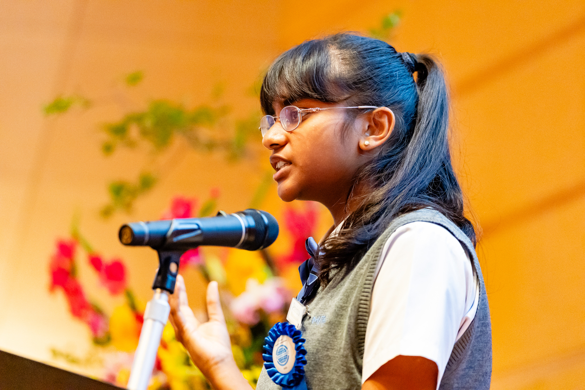 中学3年生~高校3年生部門(Grades 9〜12)トラディショナル・スピーチ部門の優勝者Preithiさんが表彰される場面