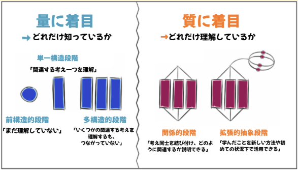 KAISでは、SOLOタクソノミーをより分かりやすく、3つの段階に分けて提示することで、生徒が表面的な学習(基礎の構築)から深い学習(関連性の構築)、そして応用レベル(理解を新しい文脈で創造的に活用する)へと段階的に進んでいくことをサポートします。つまり、教師はSOLOを用いて、生徒が単に個々の事実を収集するのではなく、基本的な理解から関連性の構築へと進み、そしてより柔軟に学習を応用できるように学習を設計します。